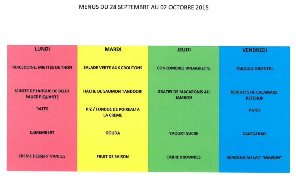 Menu – Ecole Primaire – Septembre 2015
